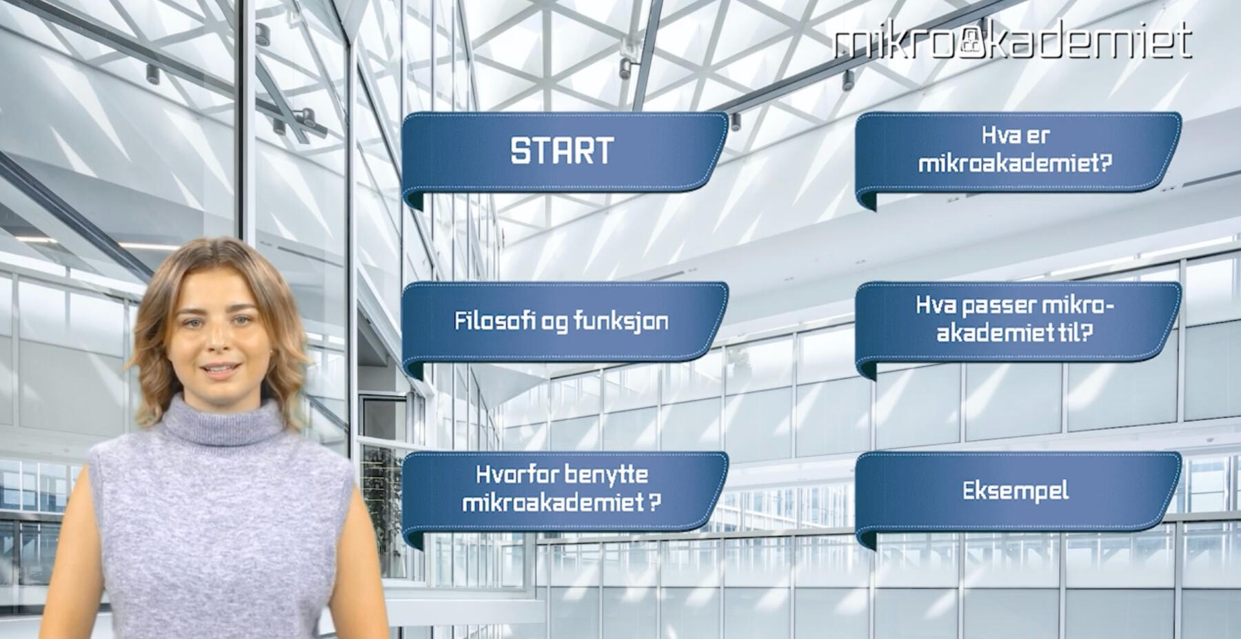 Filmbasert læring gjort interaktivt. Godt egnet til "onboarding", brukeropplæring og som en engasjerende måte å heve kompetanse på. Kan kombineres med quiz og skjema for eksamen.